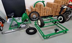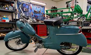Flakmopeden till vänster i bild. Den kom till oss i delar. (Mars-April 2023)