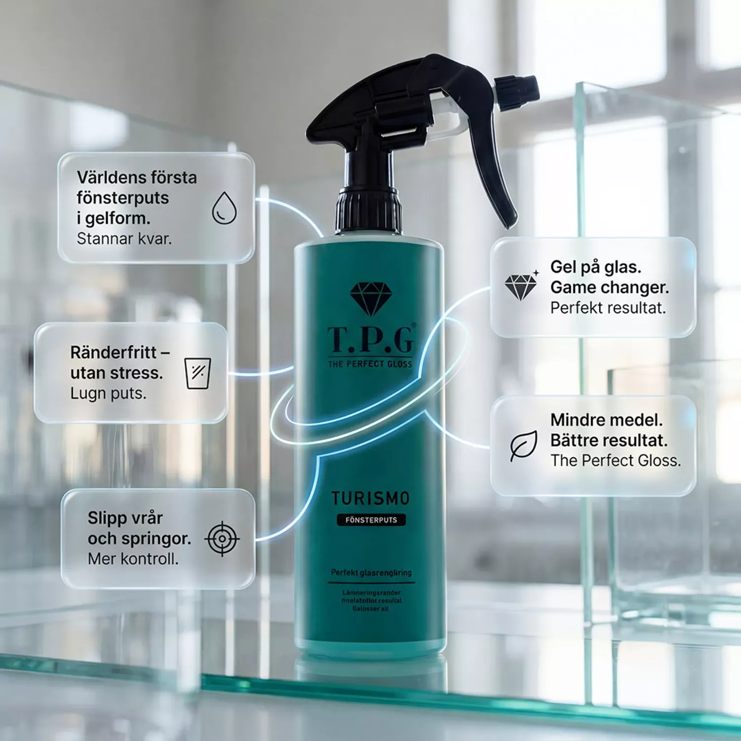 Turismo Gel Fönsterputs 500ml från The Perfect Gloss är en innovativ glasrengöring som ger kristallklara rutor utan ränder, flammor eller rester. Den unika gelformulan förändras från spray till gel på bara några sekunder, vilket gör att produkten stannar kvar på ytan och ger dig bättre kontroll och längre arbetstid vid rengöring.